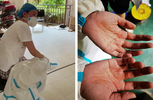 在长沙某小区 ,一名采样人员出现中暑症状;3003.com新葡的京采样人员双手被汗水泡得发白、发皱